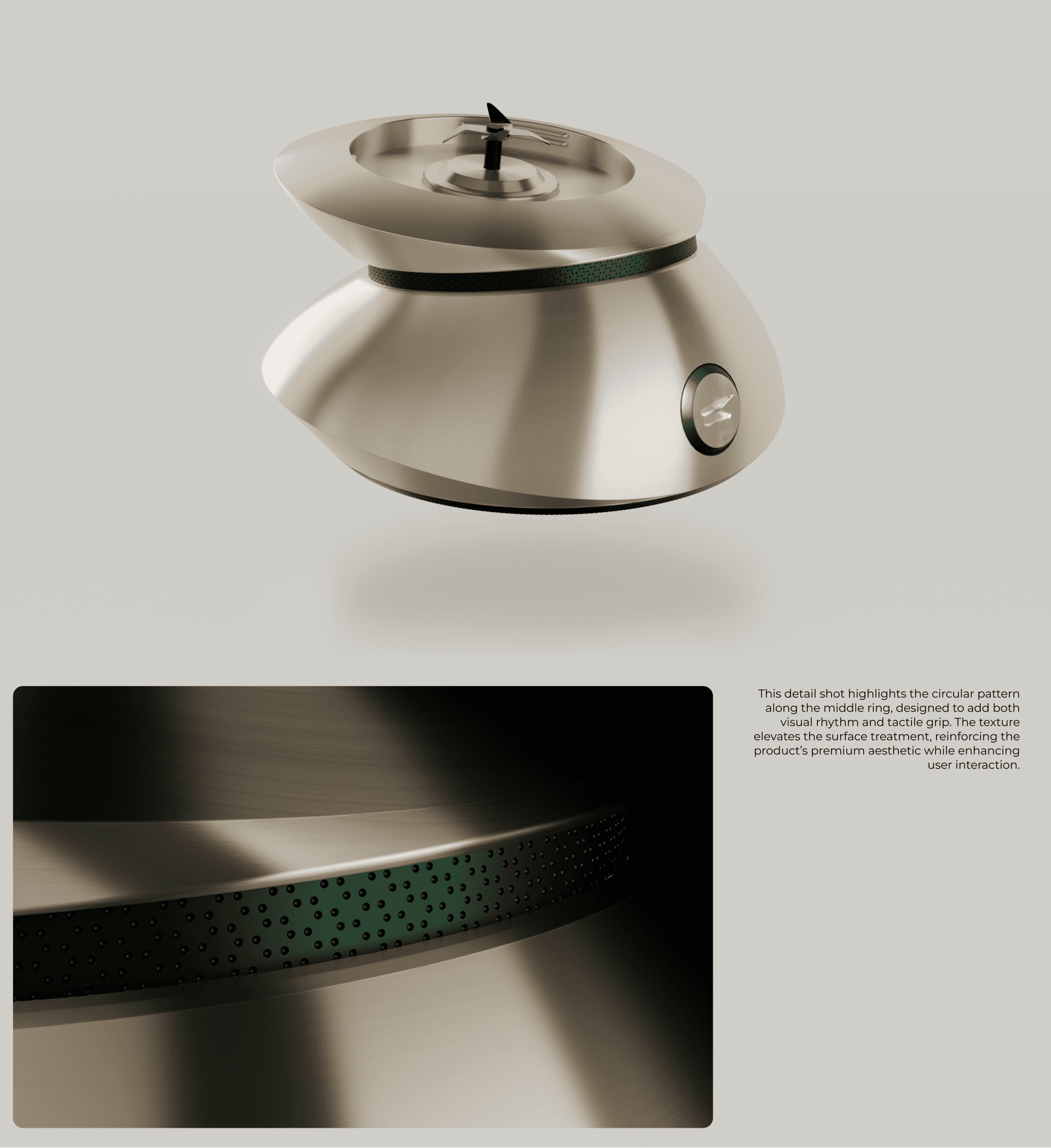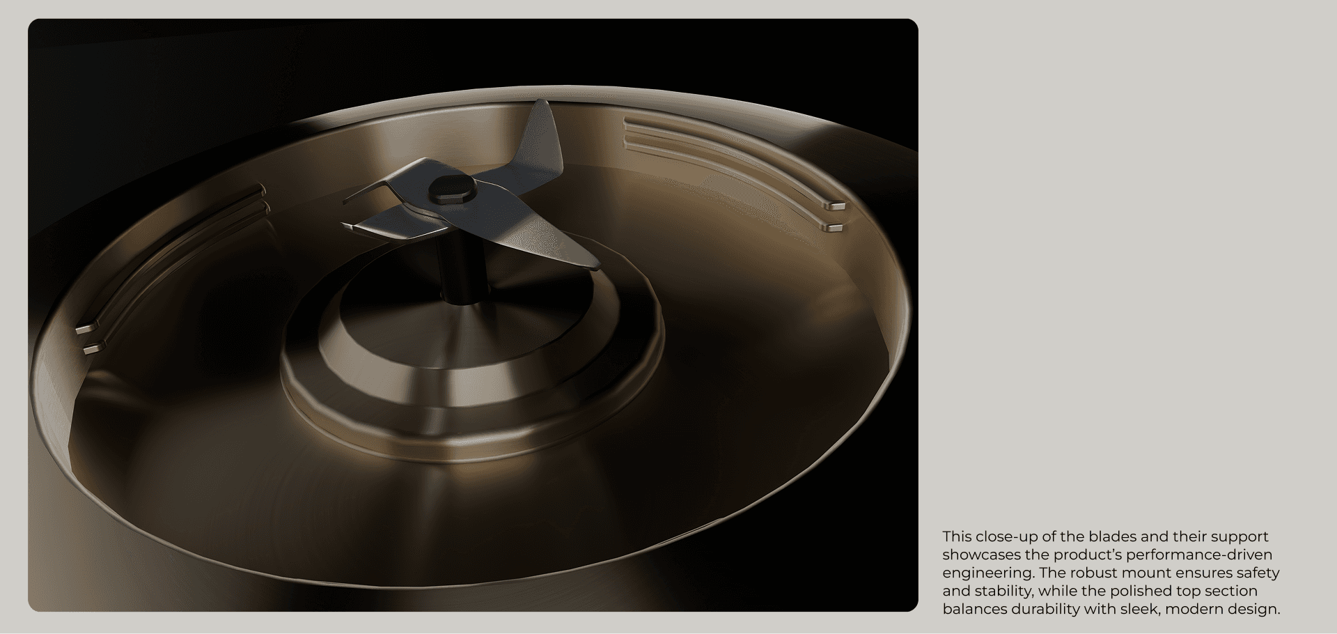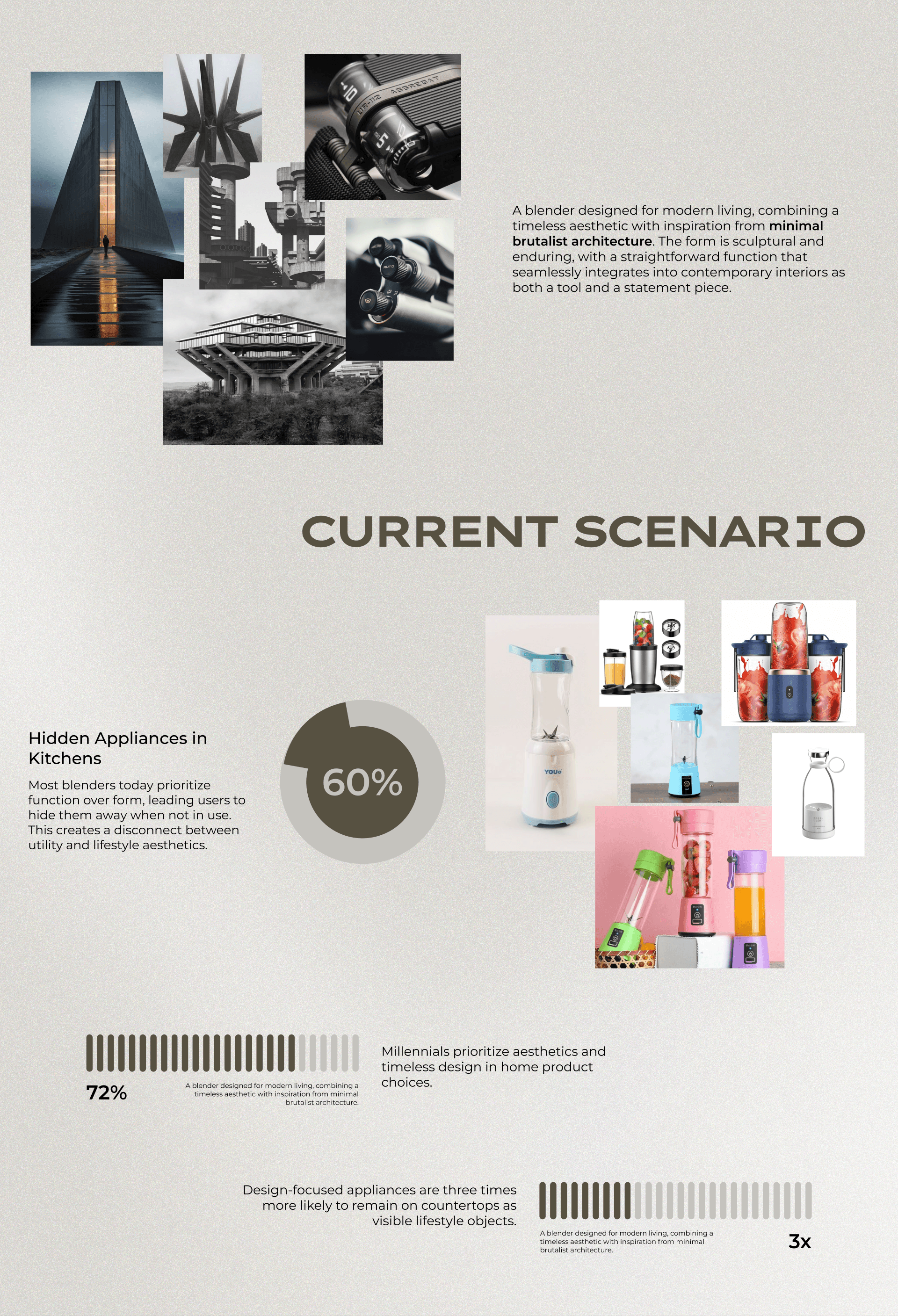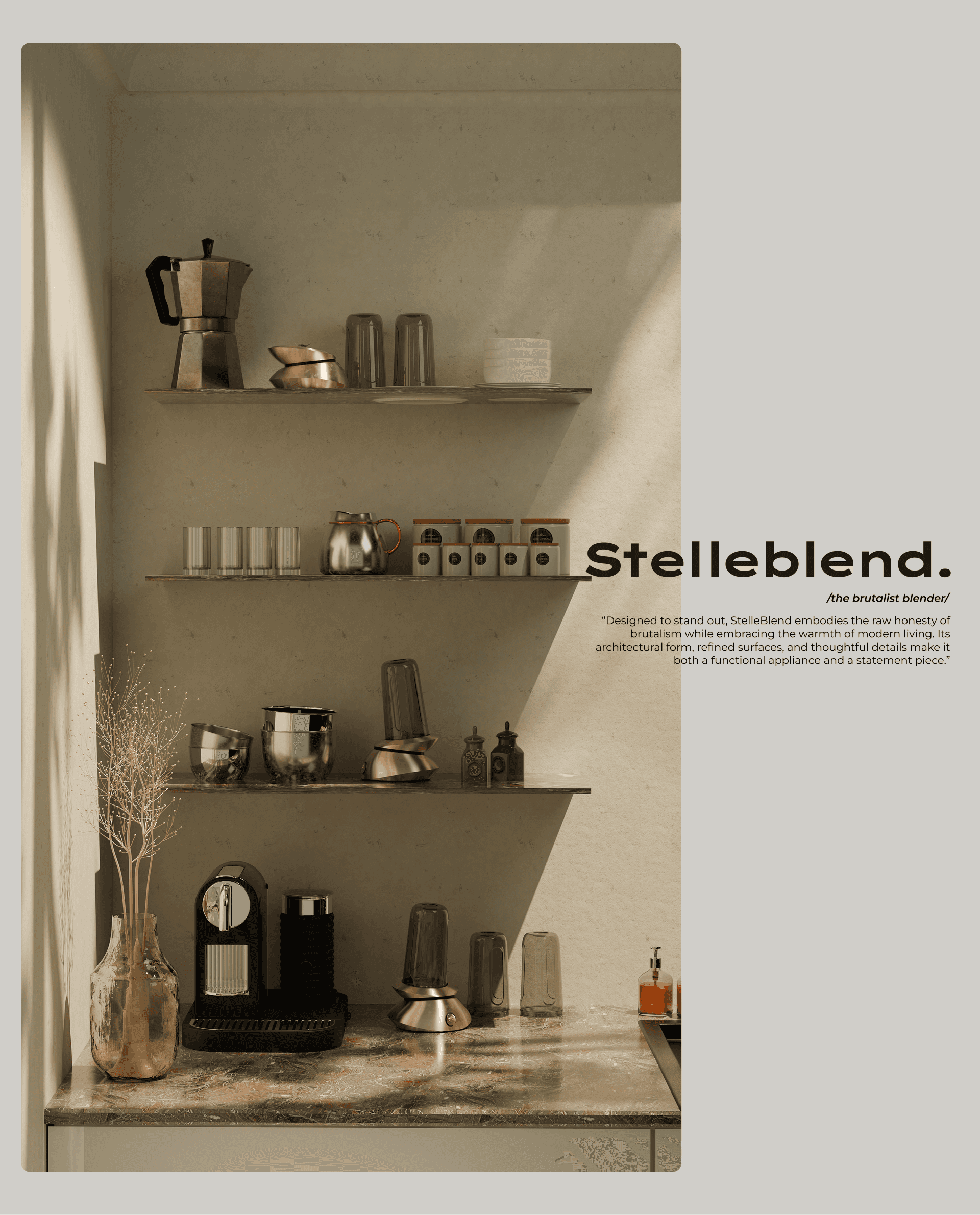 A blender designed for modern living, combining a timeless aesthetic with inspiration from minimal brutalist architecture. The form is sculptural and enduring, with a straightforward function that seamlessly integrates into contemporary interiors as both a tool and a statement piece.