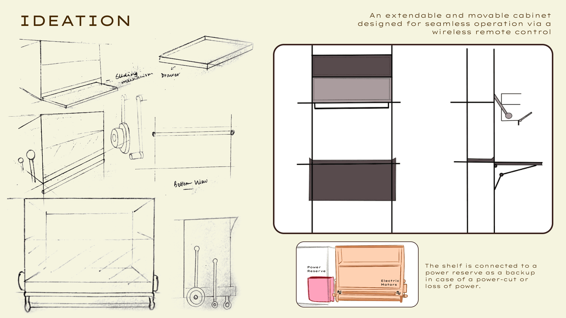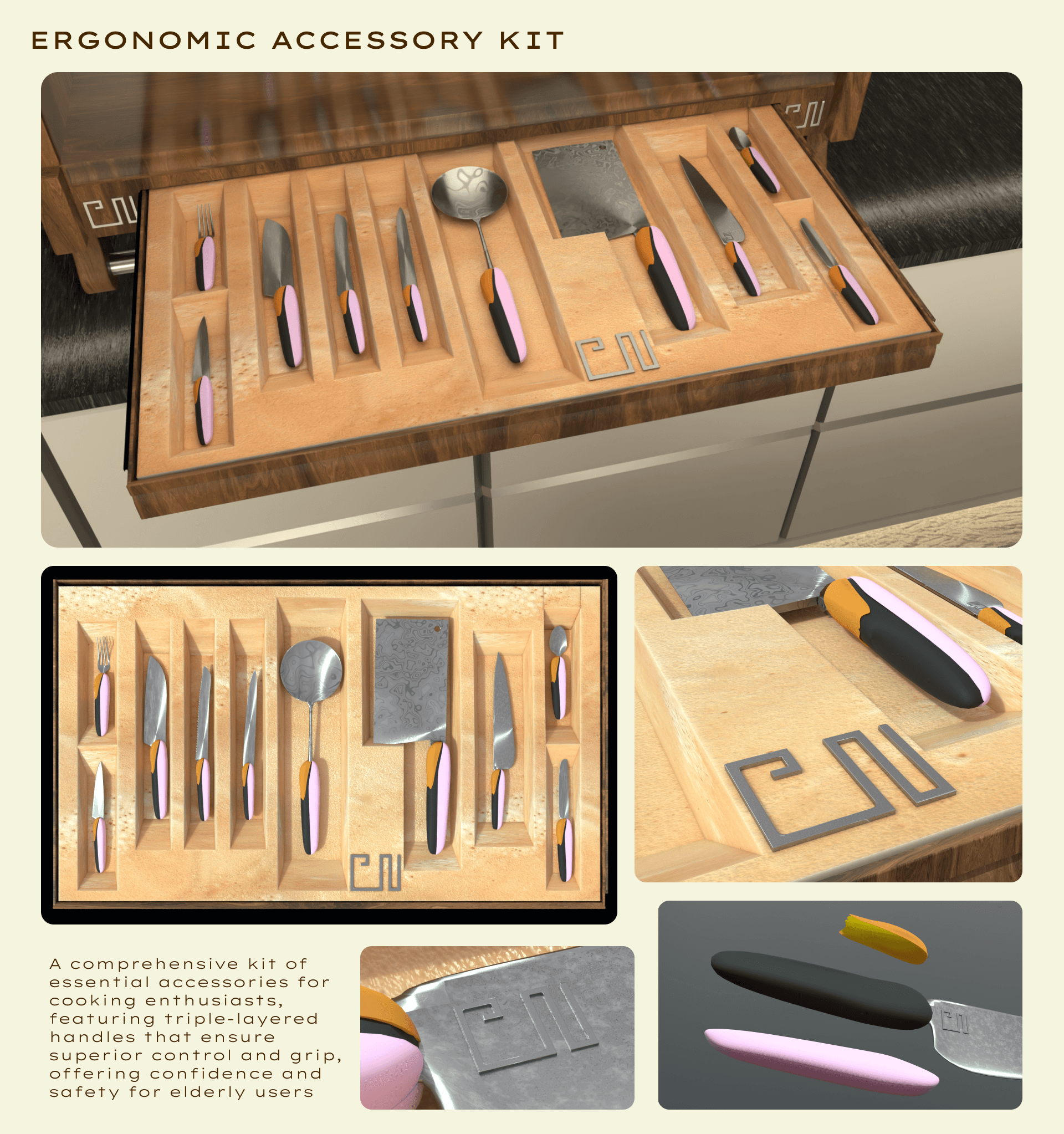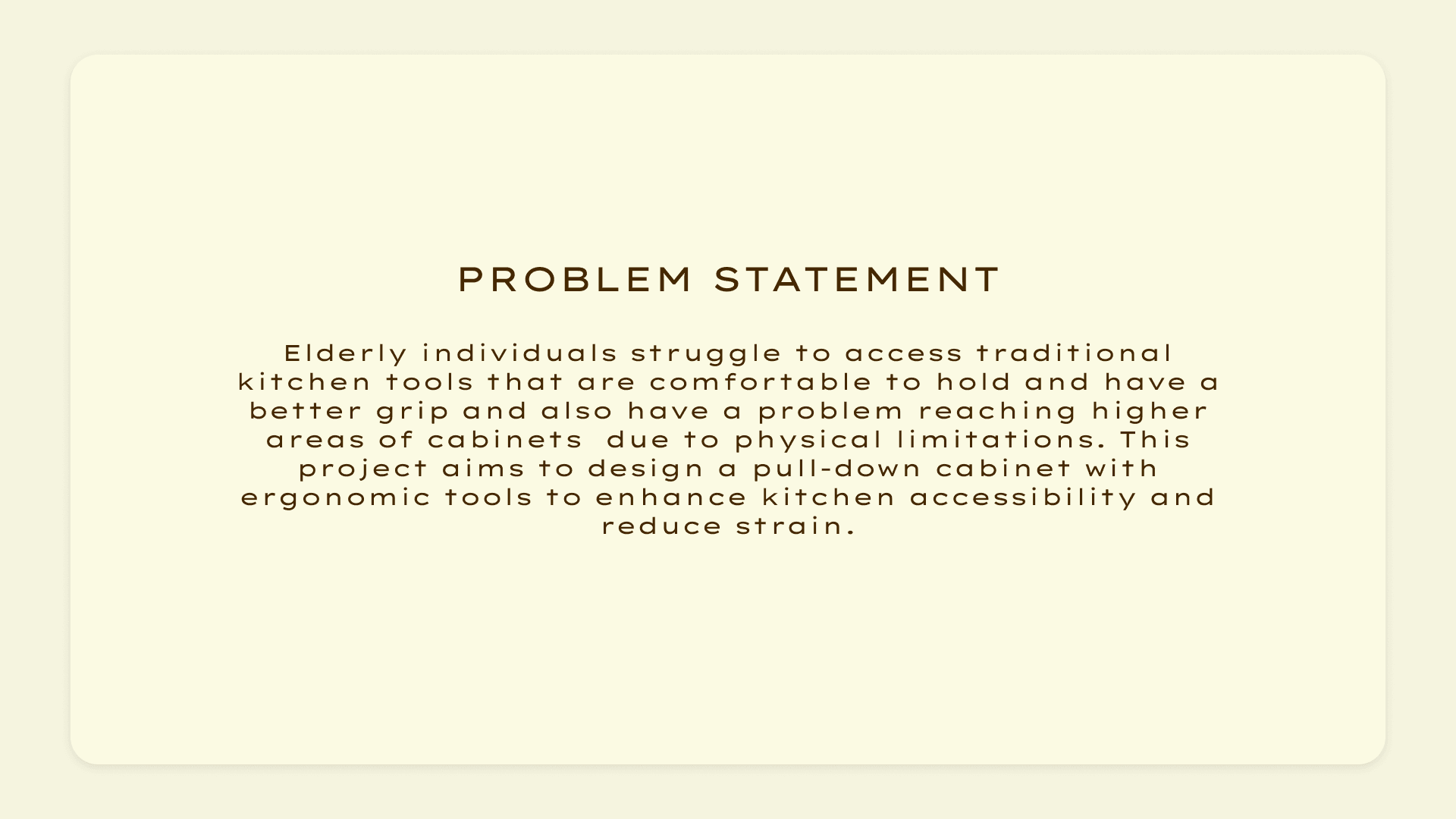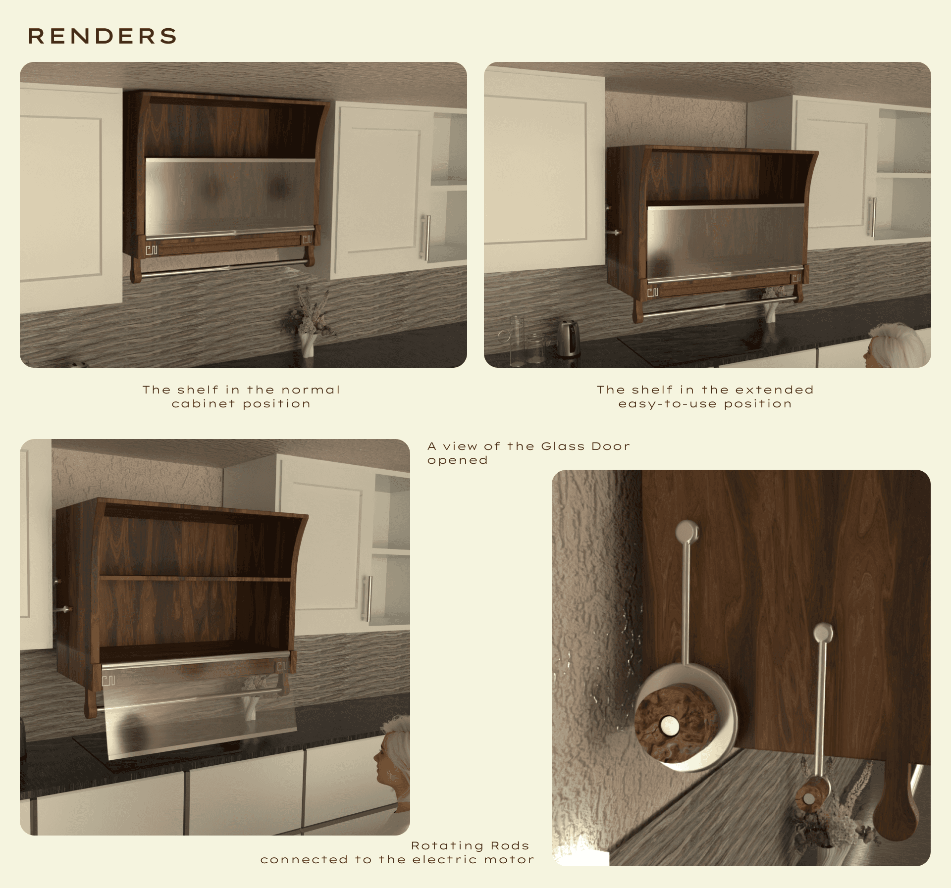 Elderly individuals struggle to access traditional kitchen tools that are comfortable to hold and have a better grip and also have a problem reaching higher areas of cabinets due to physical limitations. This project aims to design a pull-down cabinet with ergonomic tools to enhance kitchen accessibility and reduce strain.