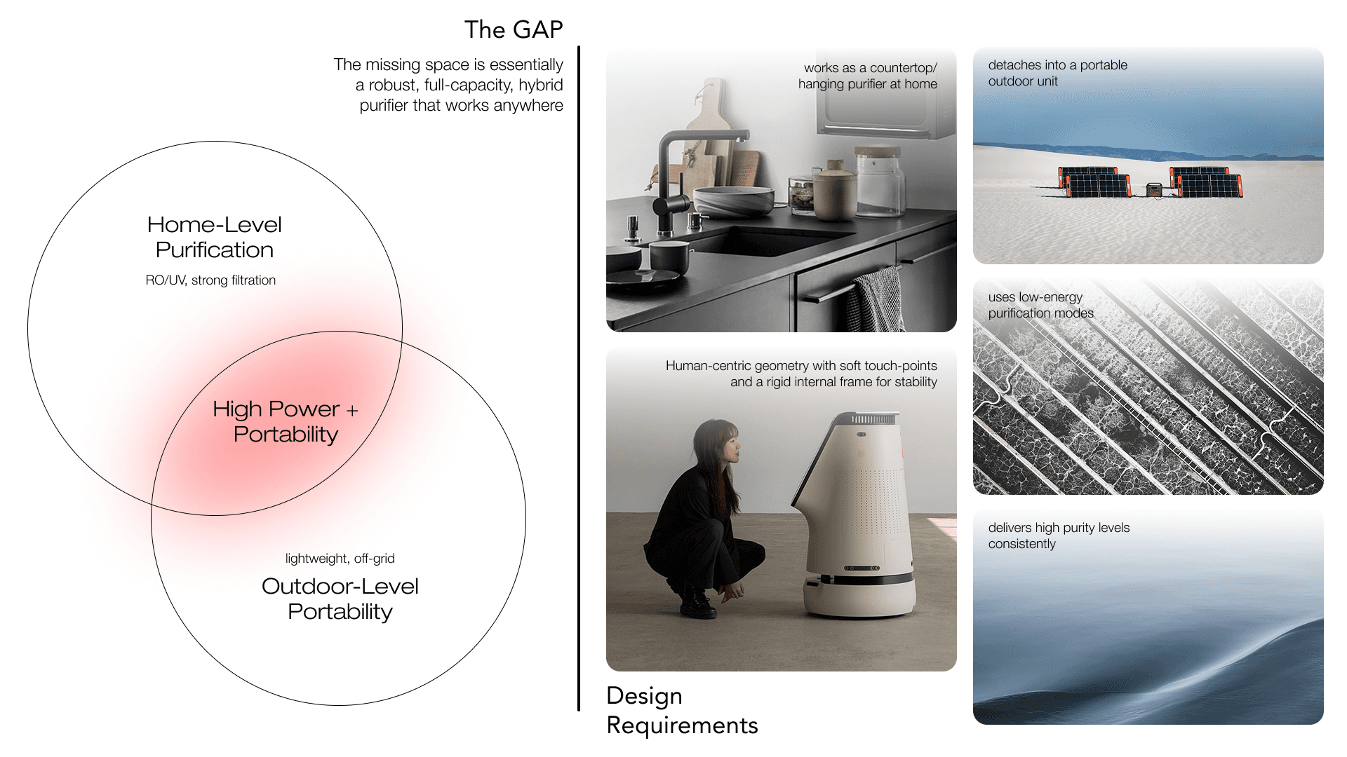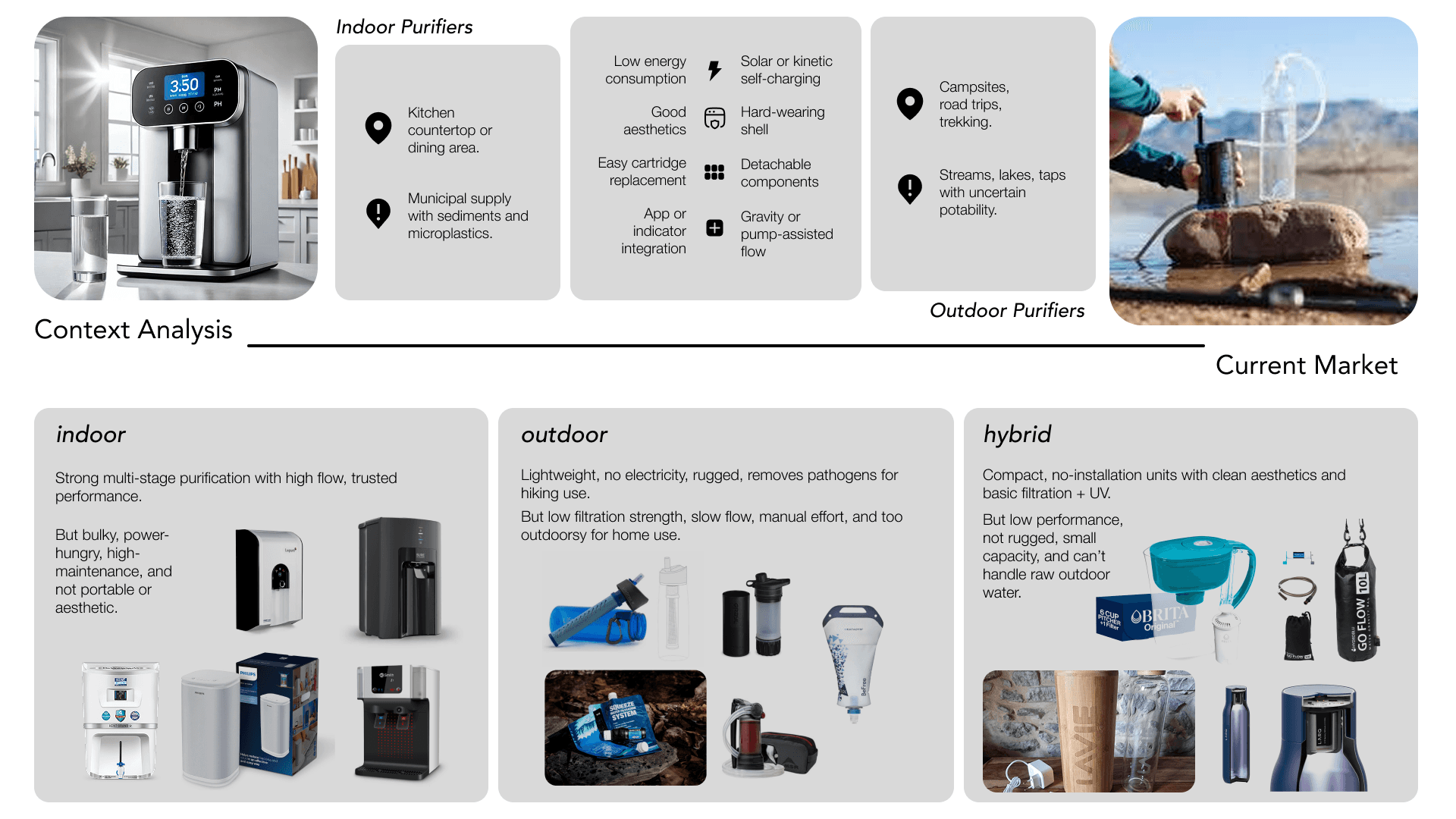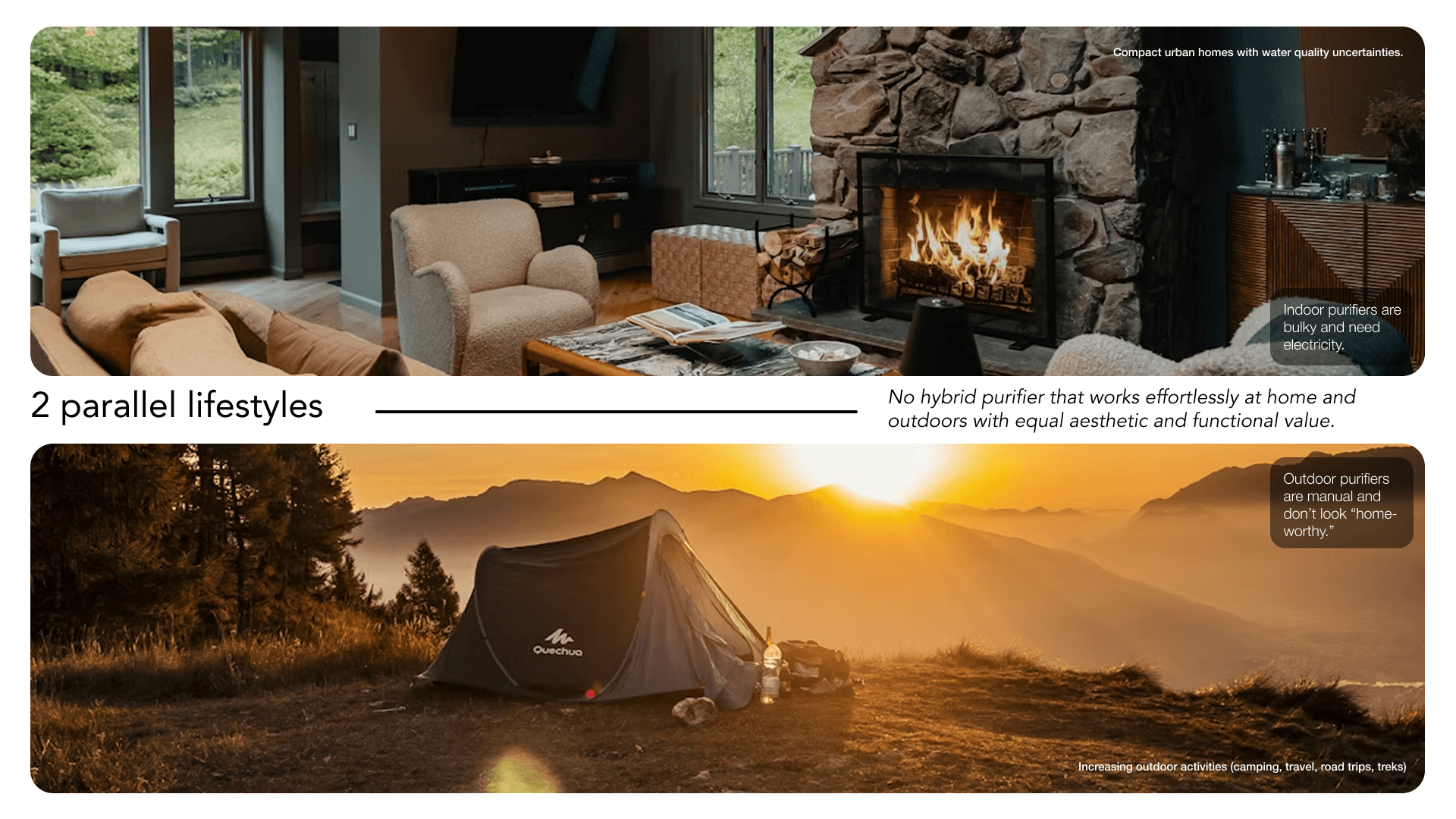 A 7-day design sprint exploring a hybrid water purifier that bridges two very different contexts—home and outdoors.