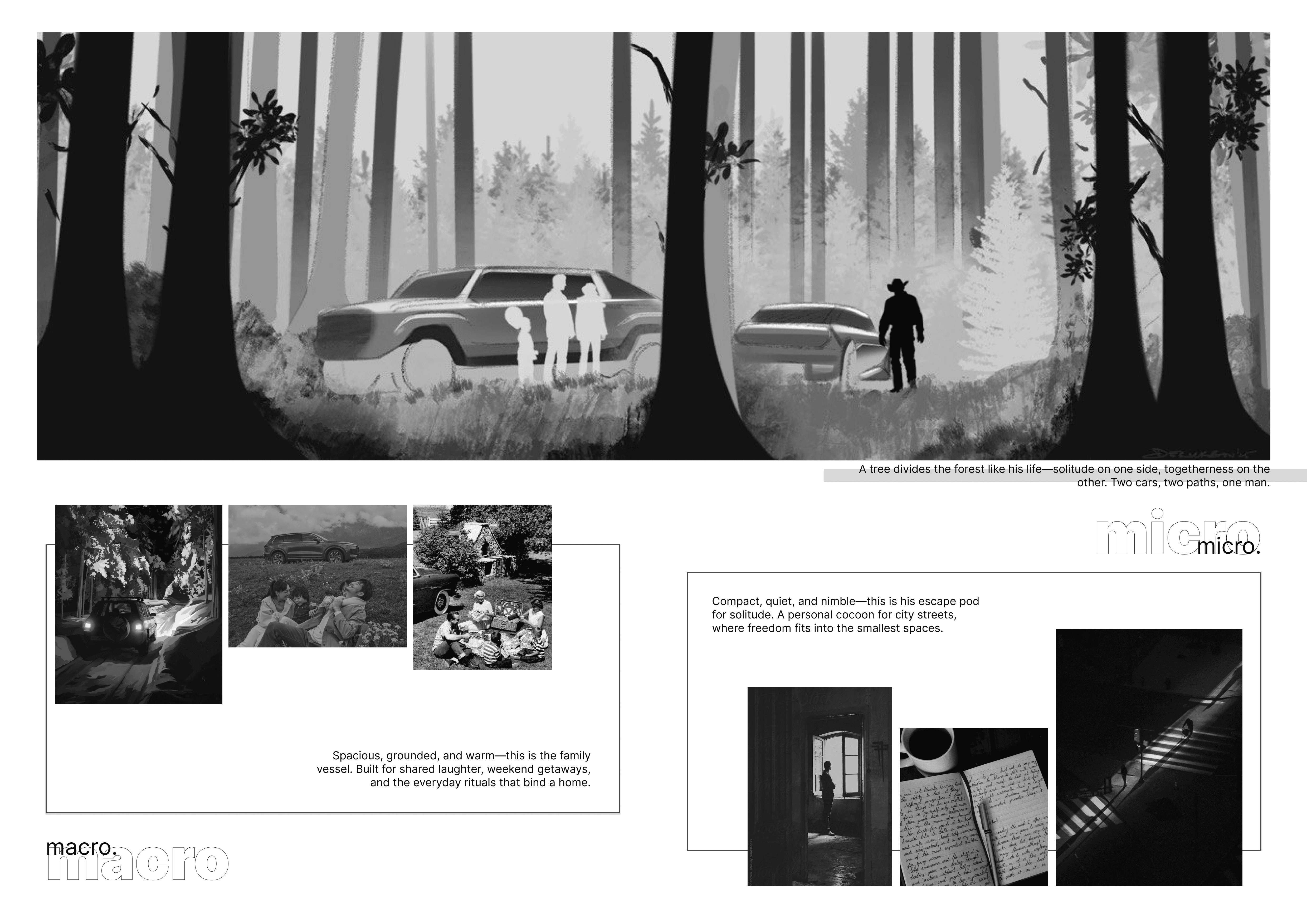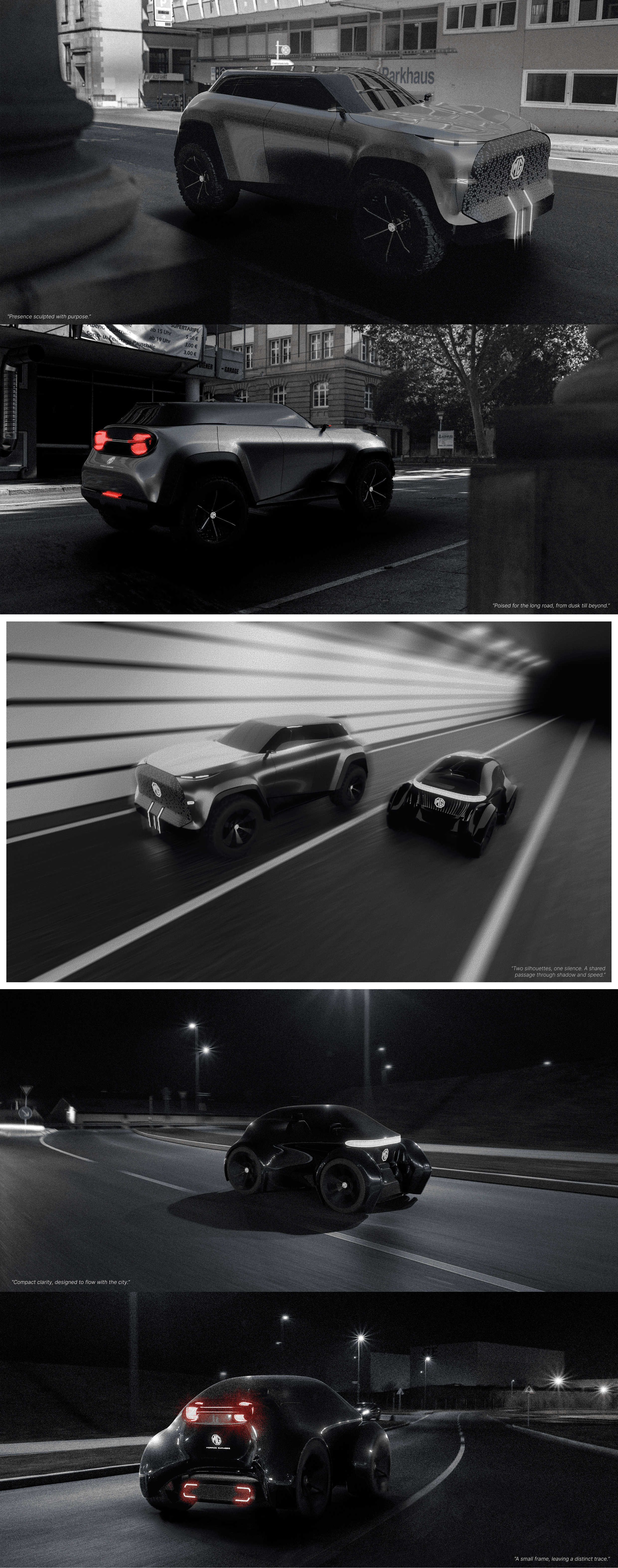 A dual-vehicle vision that reflects the modern man’s need for separation—between solitude and togetherness, between stillness and motion. This MG microcar and SUV pair embody two distinct lives lived side by side, yet never in conflict.
