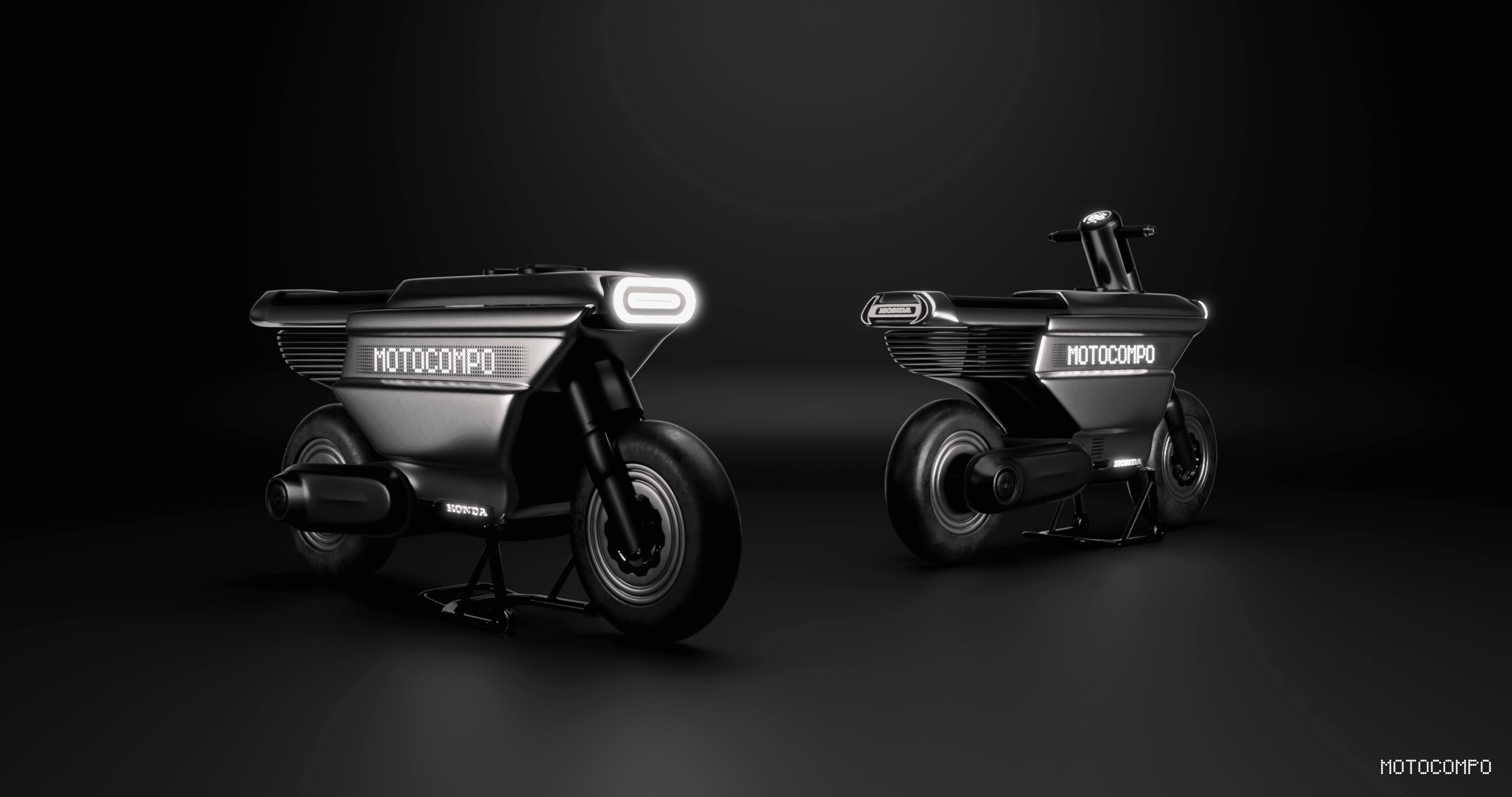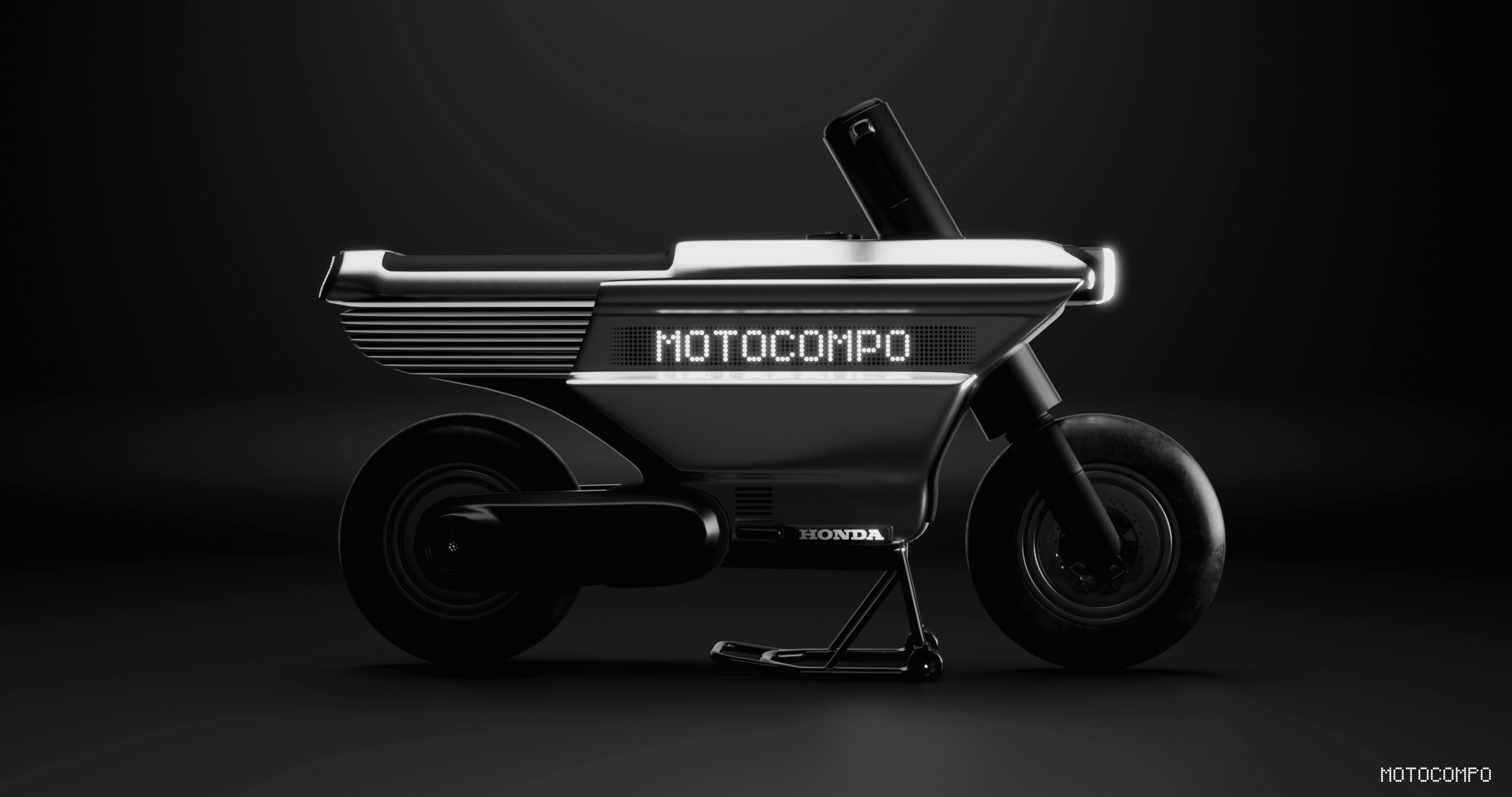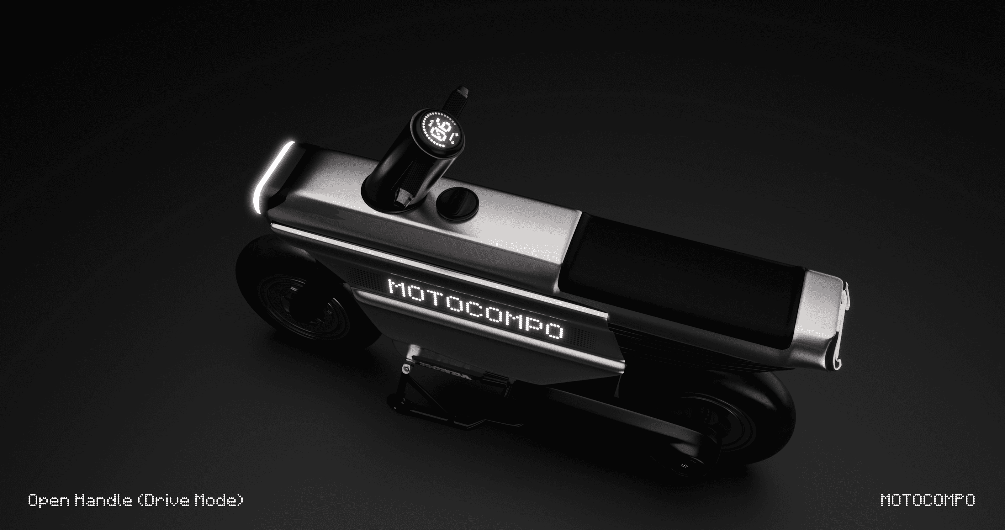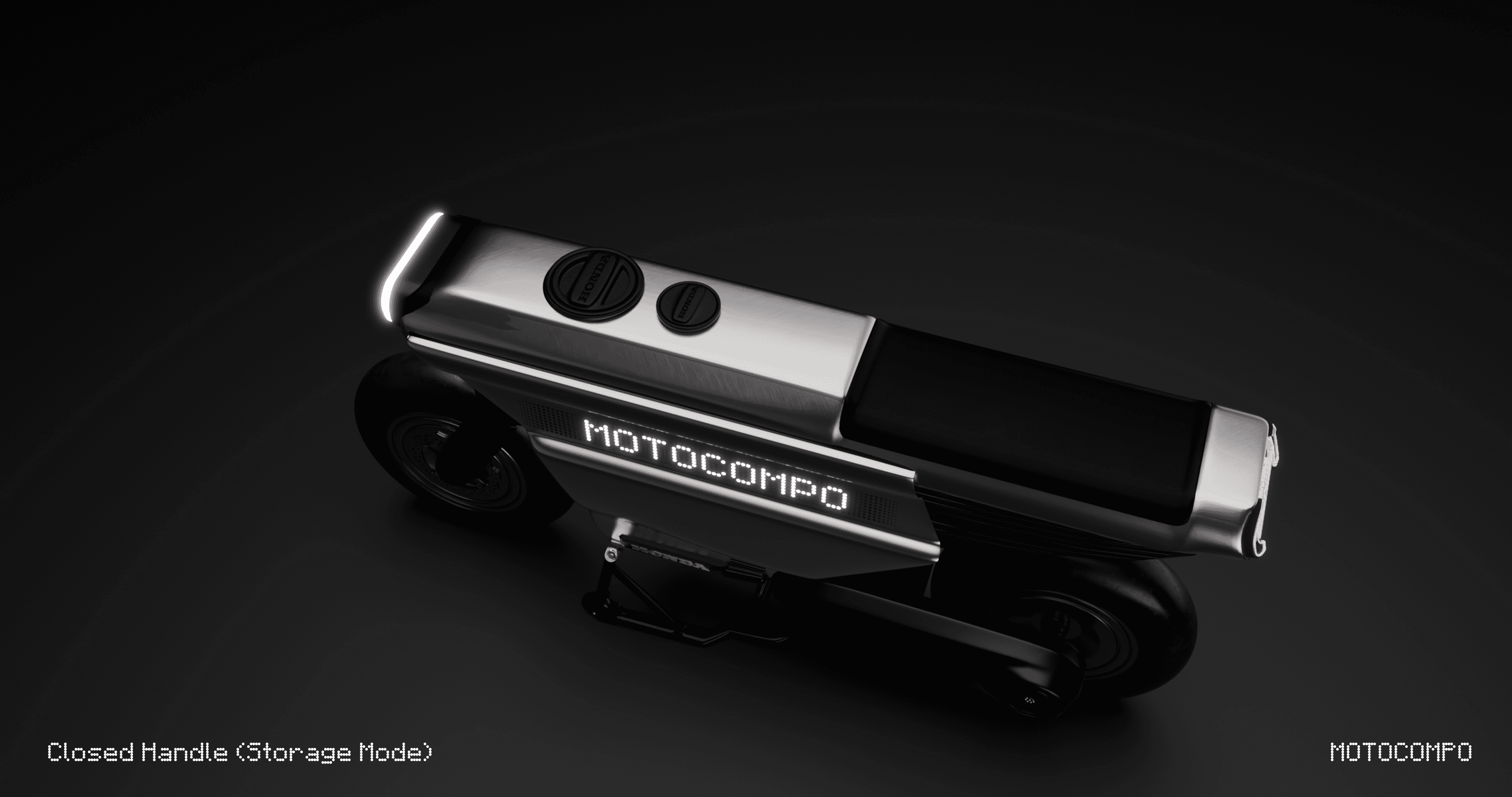 A futuristic reimagination of Honda's iconic Motocompo from the 1980s, redesigned for the modern world with influences from brutalist architecture and industrial minimalism.