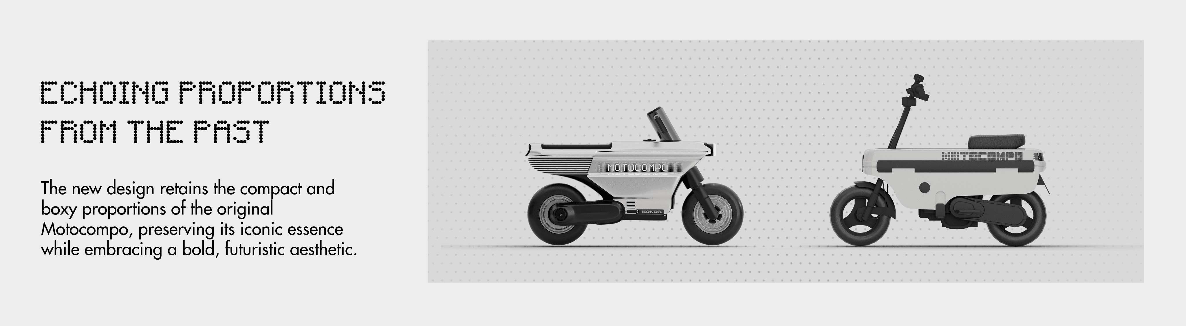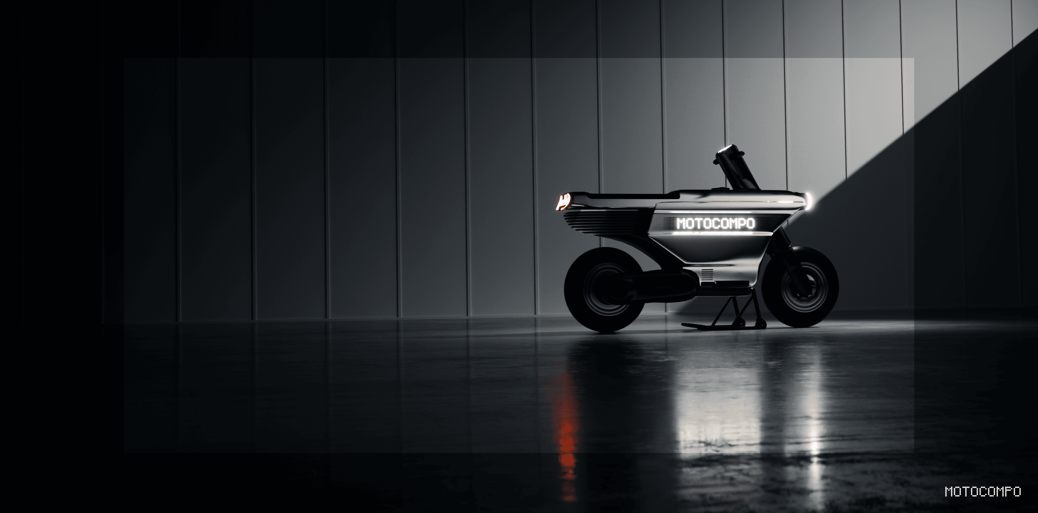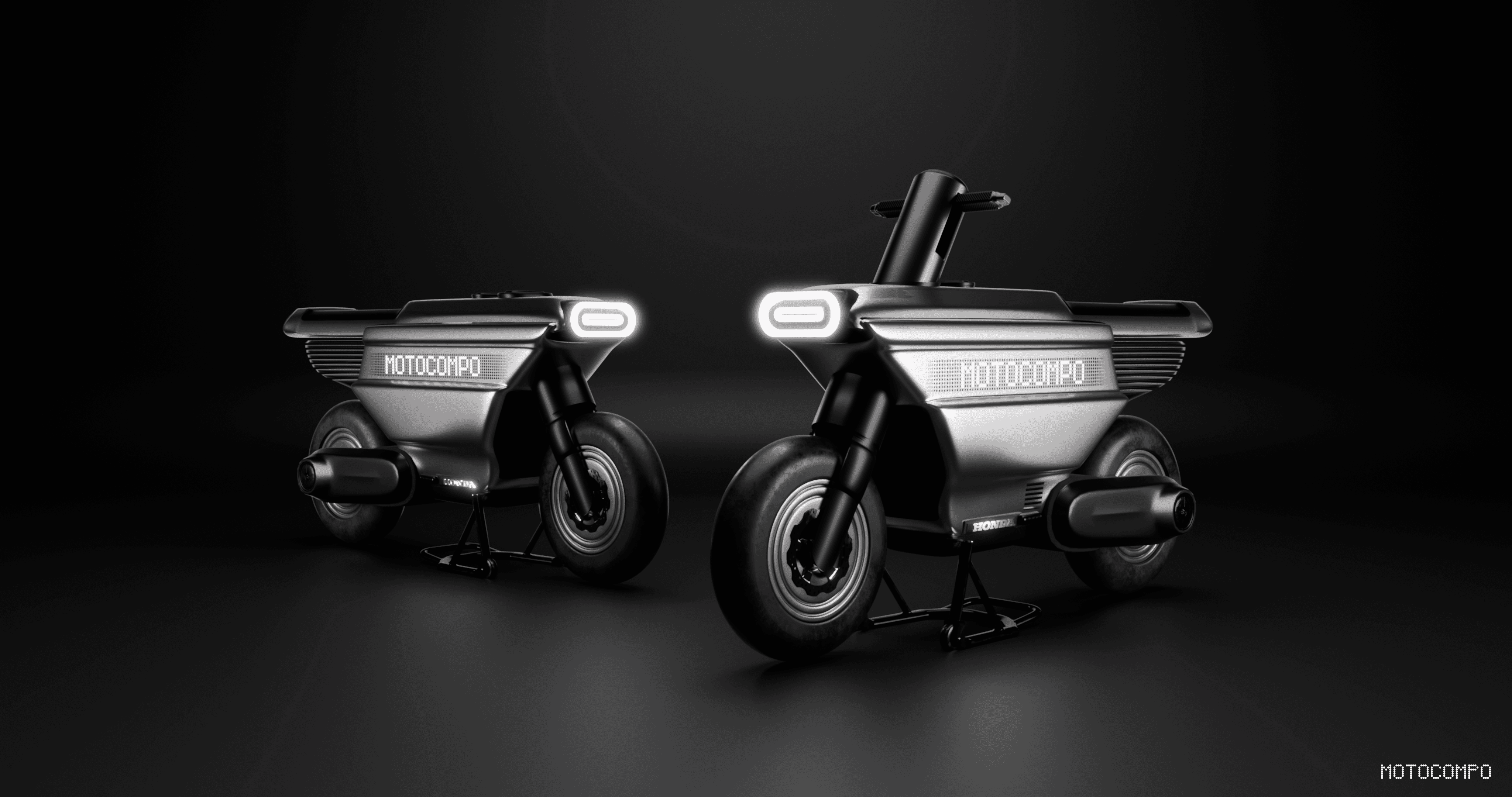 A futuristic reimagination of Honda's iconic Motocompo from the 1980s, redesigned for the modern world with influences from brutalist architecture and industrial minimalism.