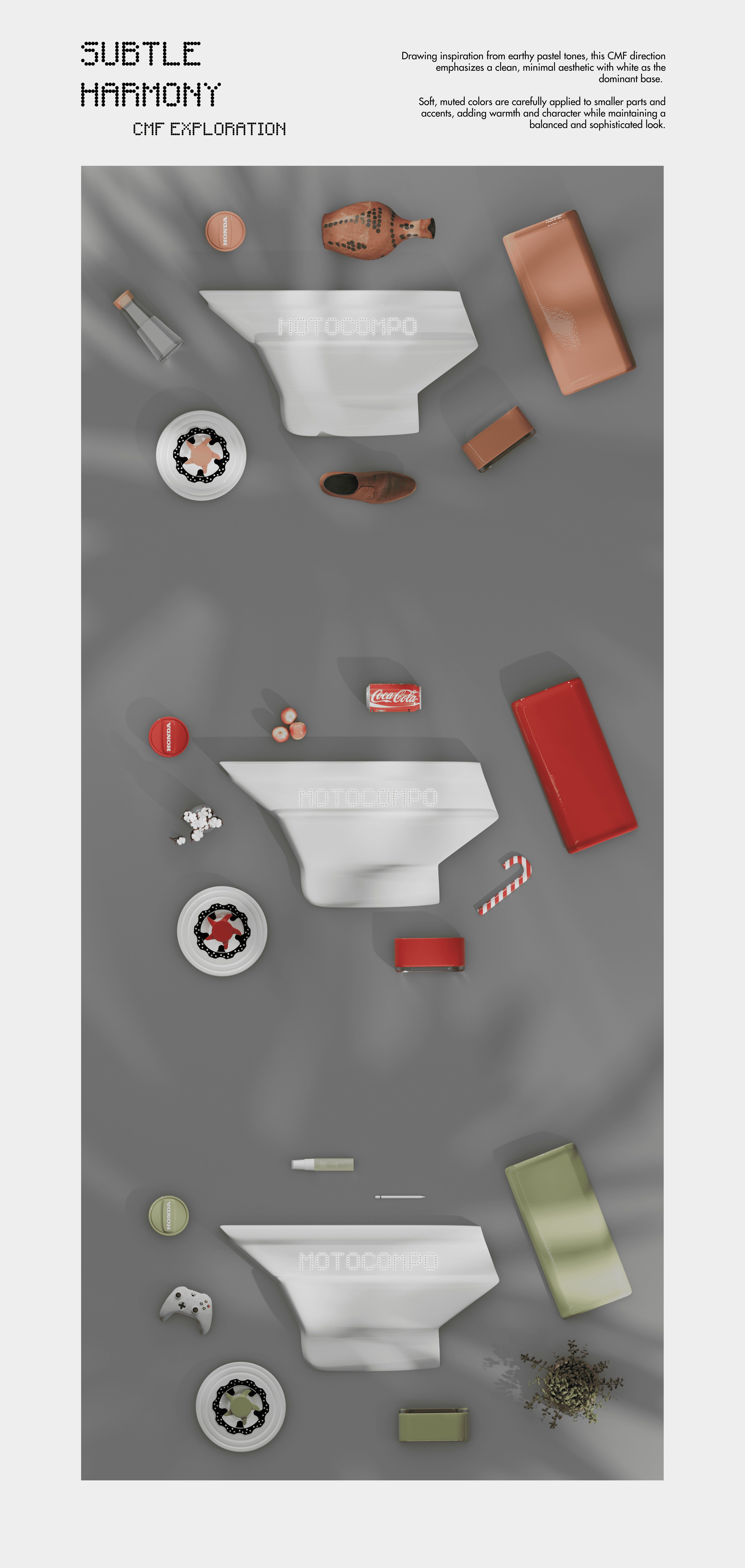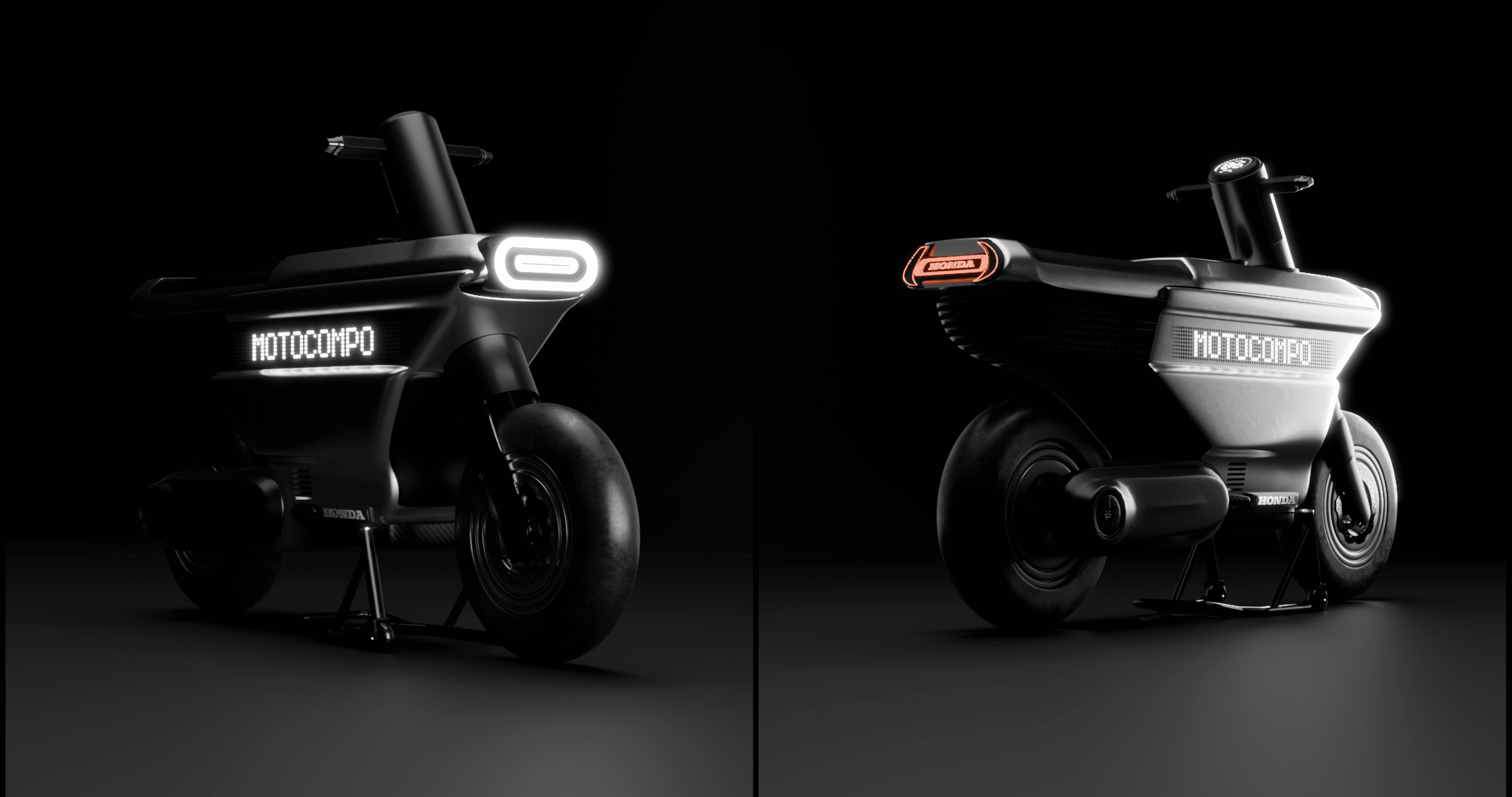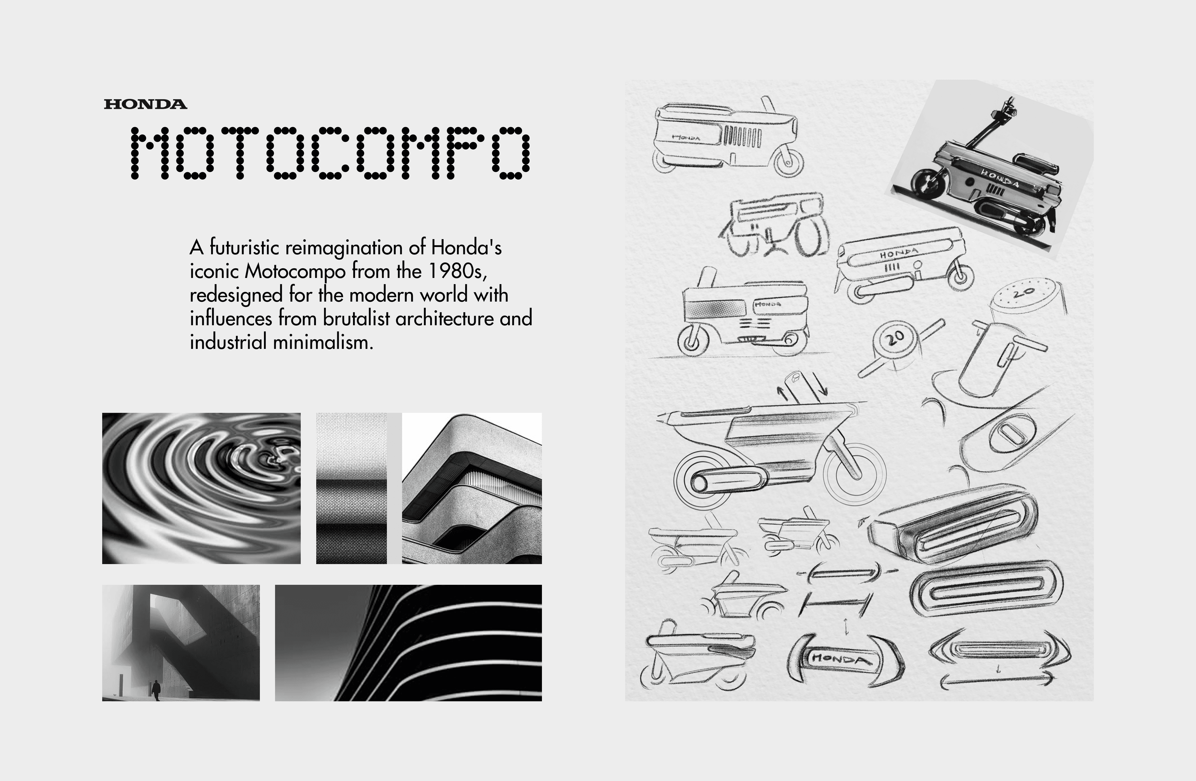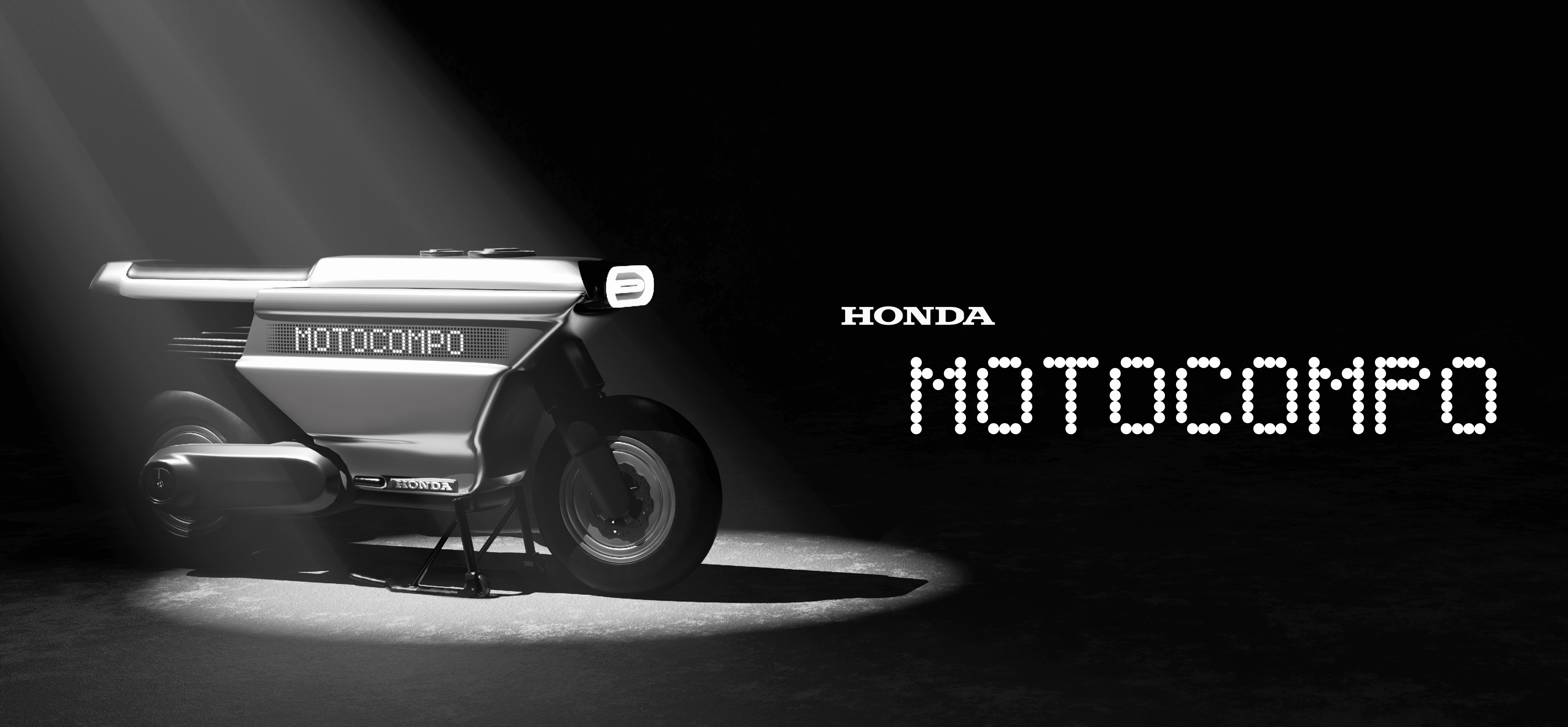 A futuristic reimagination of Honda's iconic Motocompo from the 1980s, redesigned for the modern world with influences from brutalist architecture and industrial minimalism.