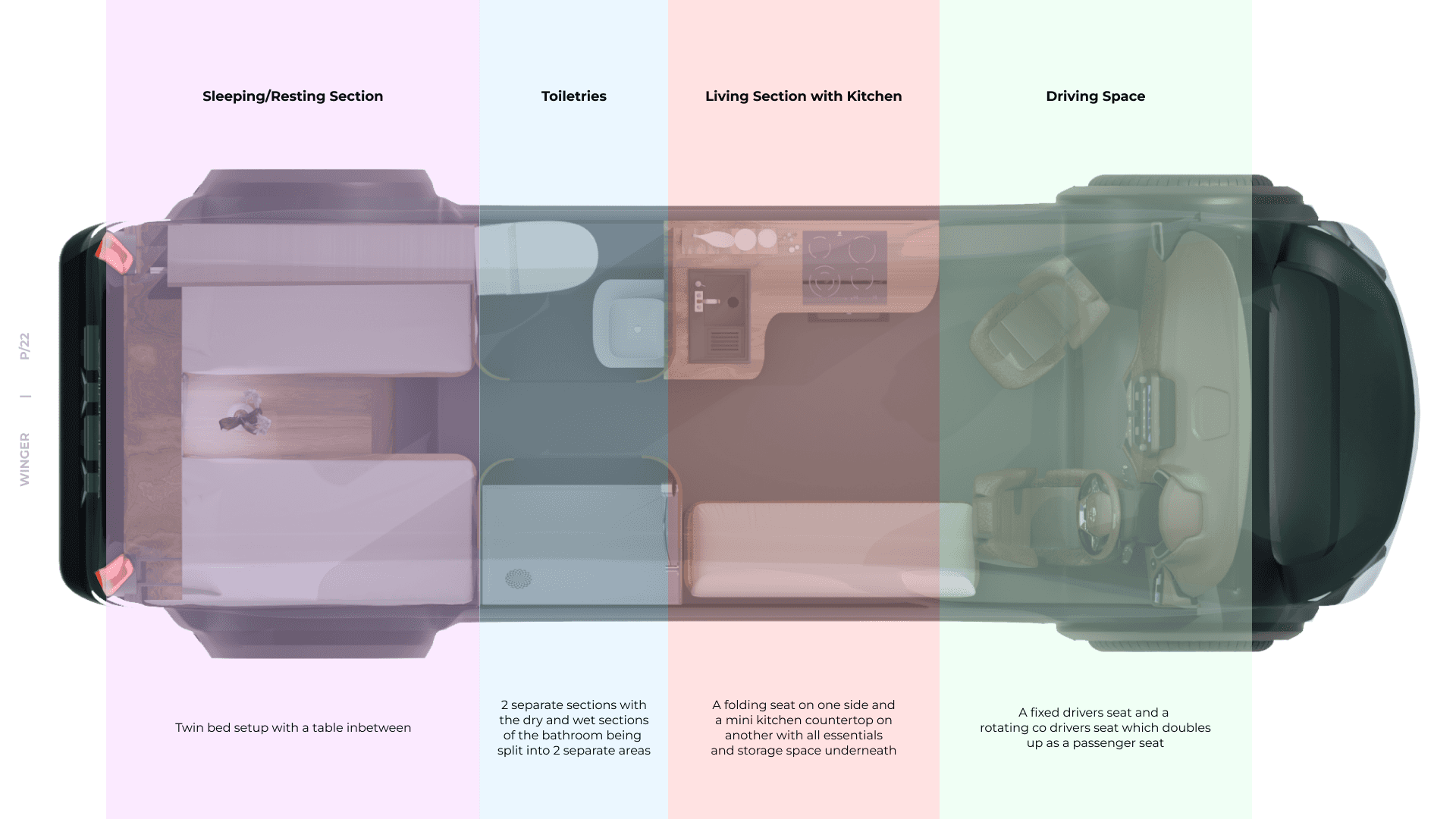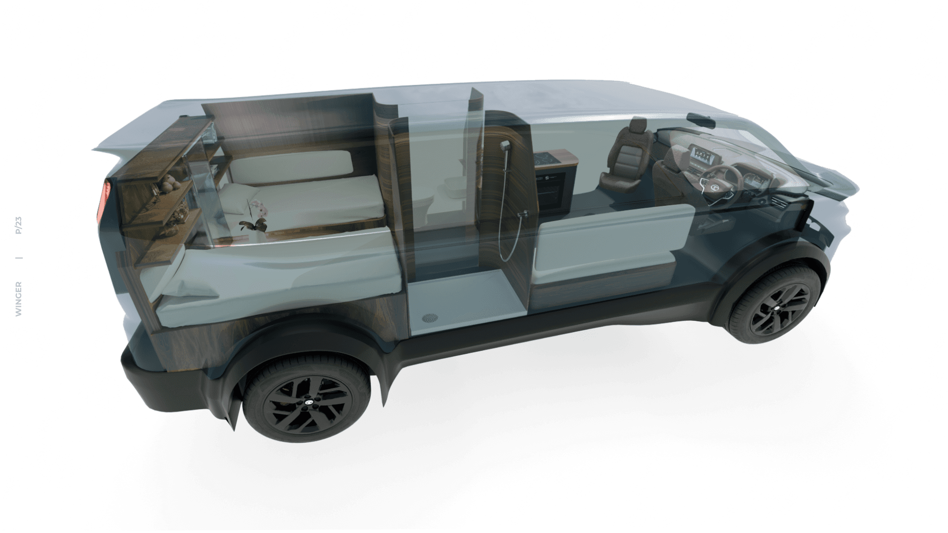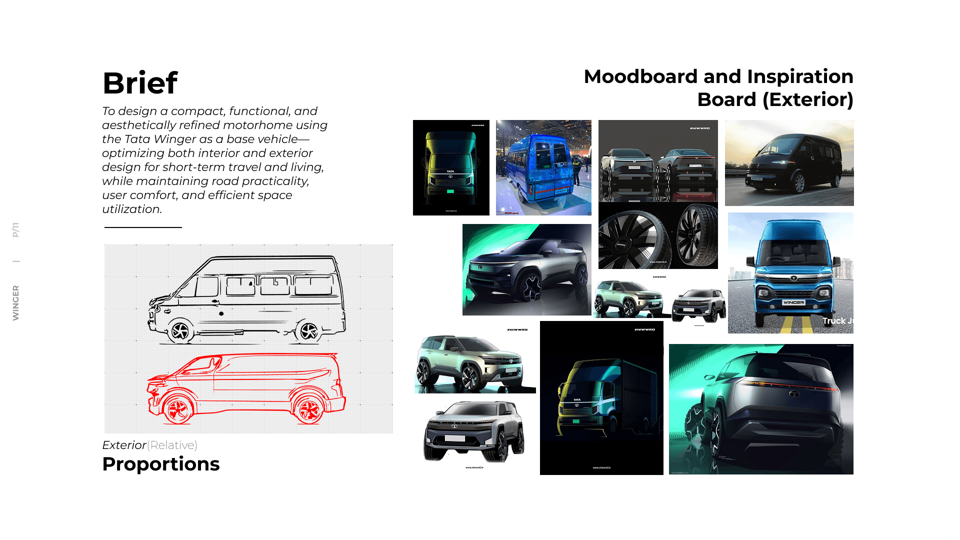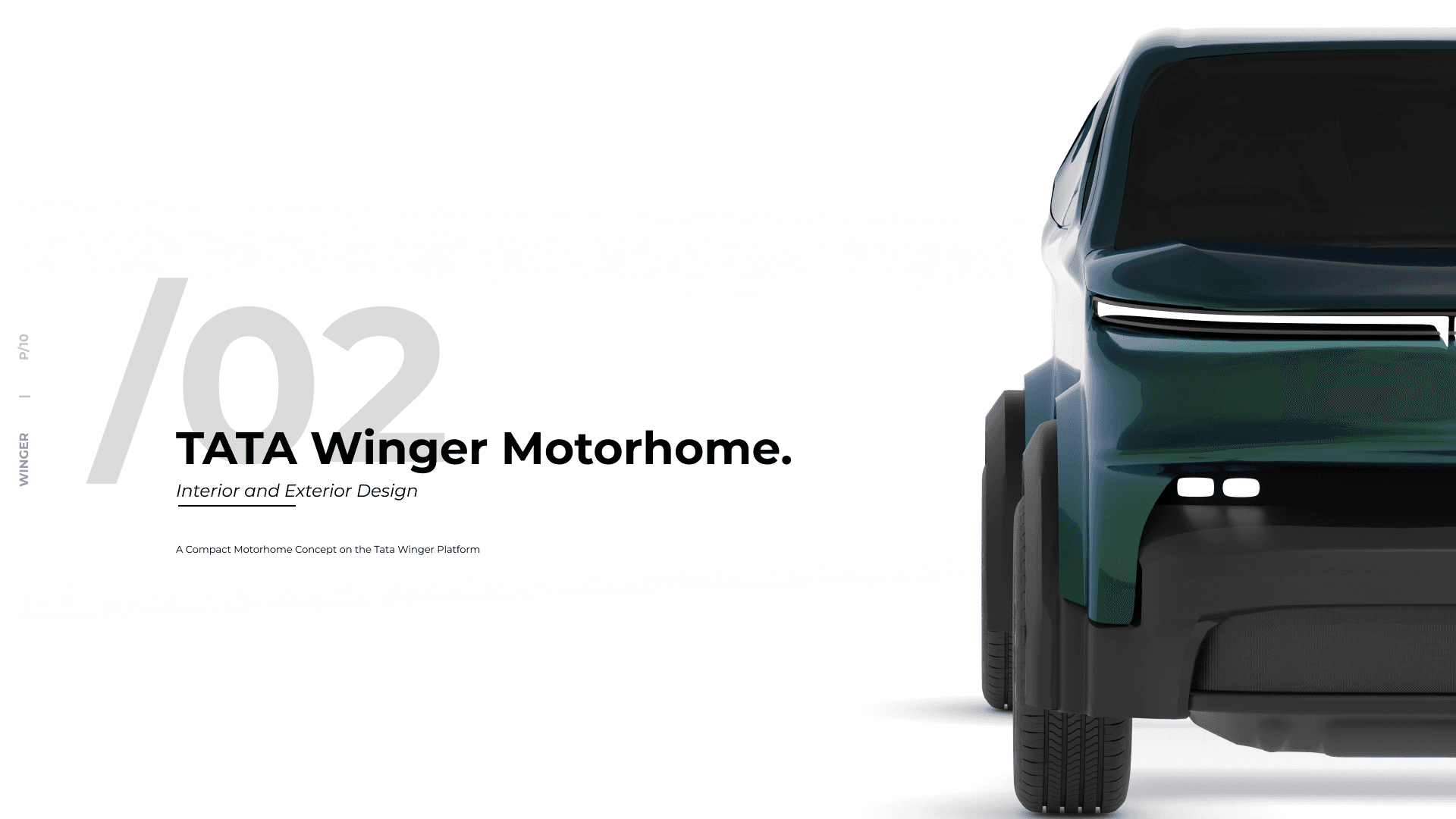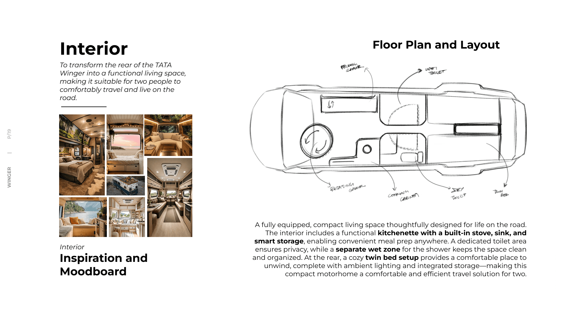 A compact, functional, and aesthetically refined motorhome using the Tata Winger as a base vehicle—optimizing both interior and exterior design for short-term travel and living, while maintaining road practicality, user comfort, and efficient space utilization in a duration of 3 days.